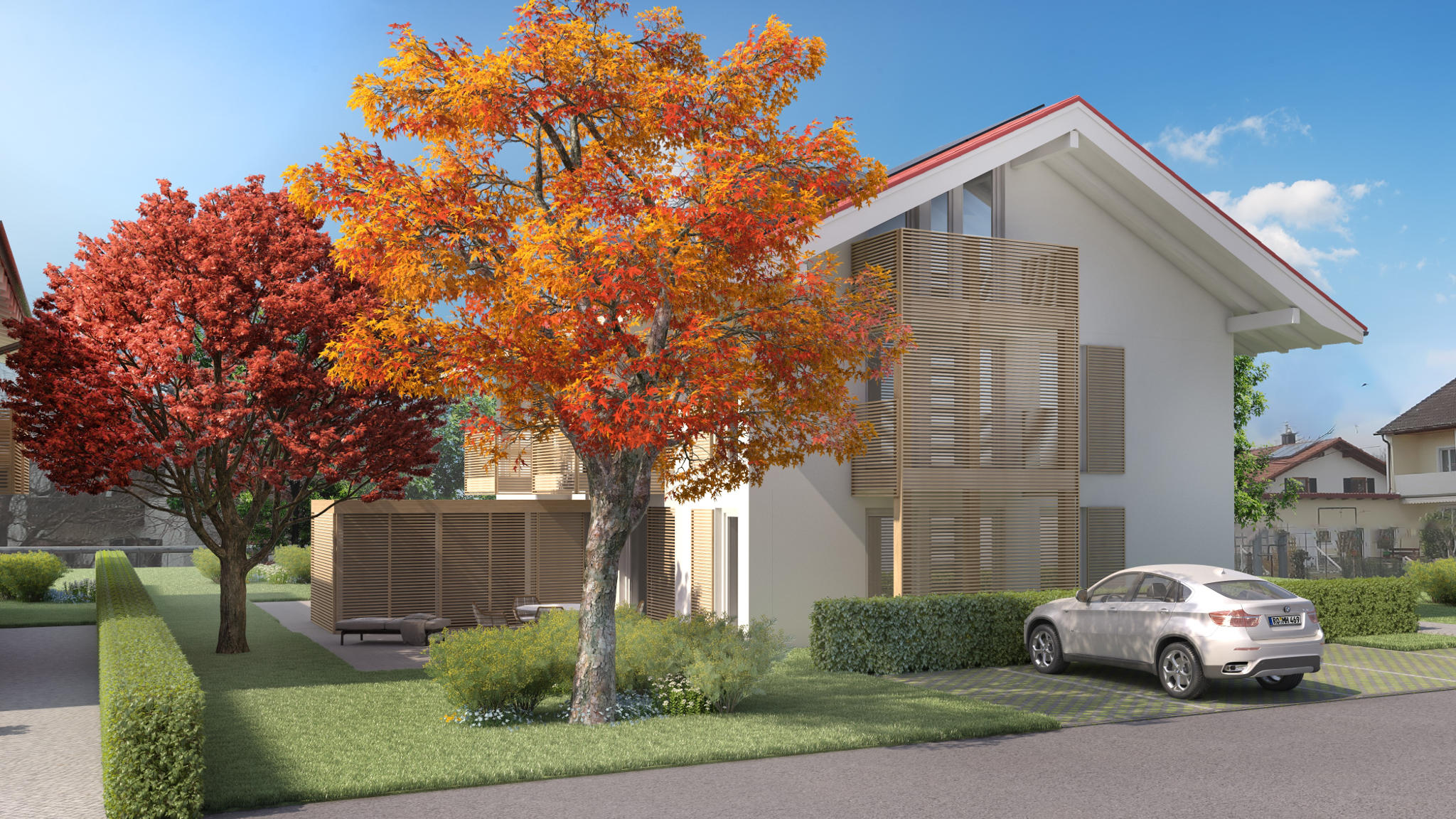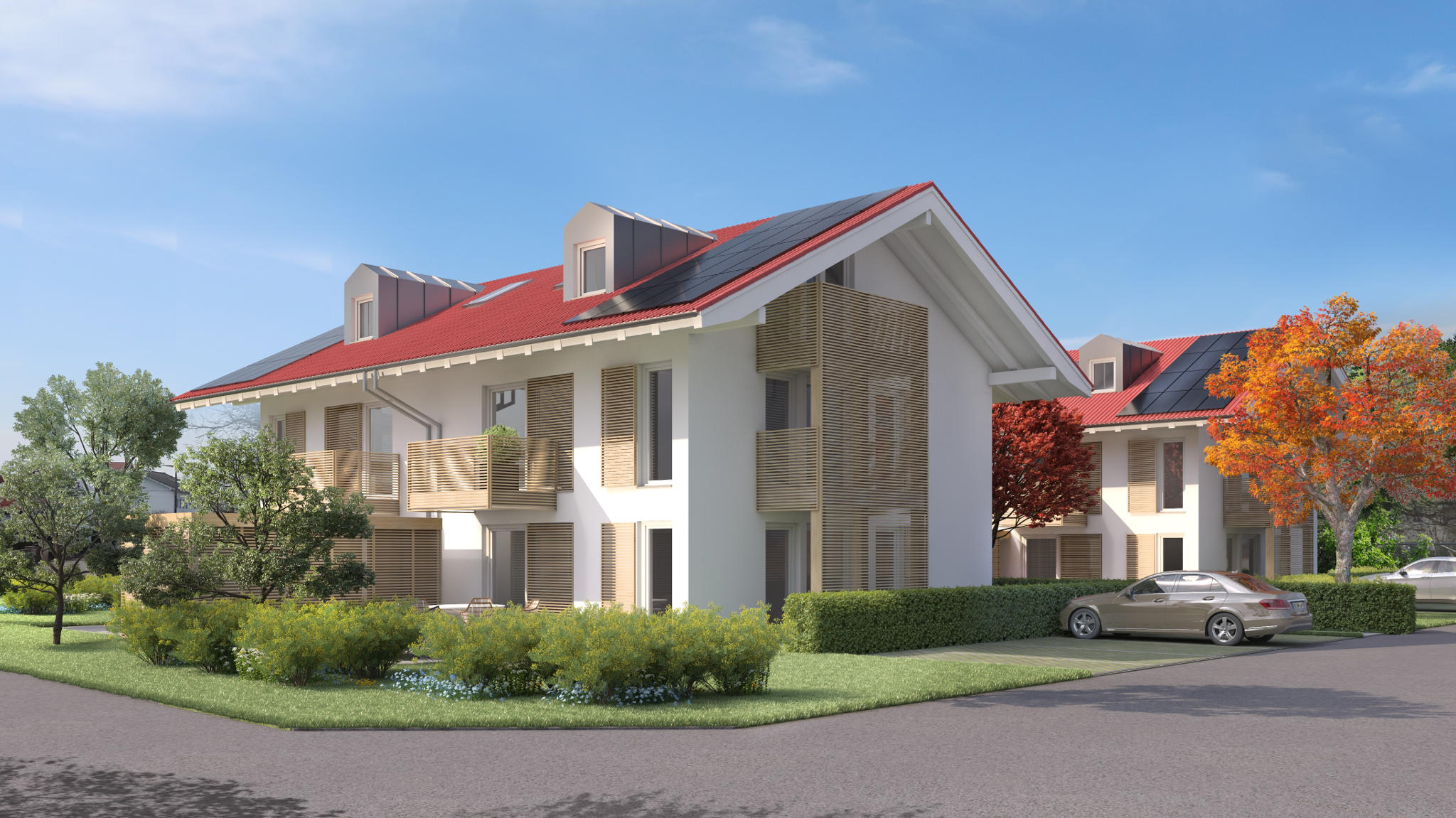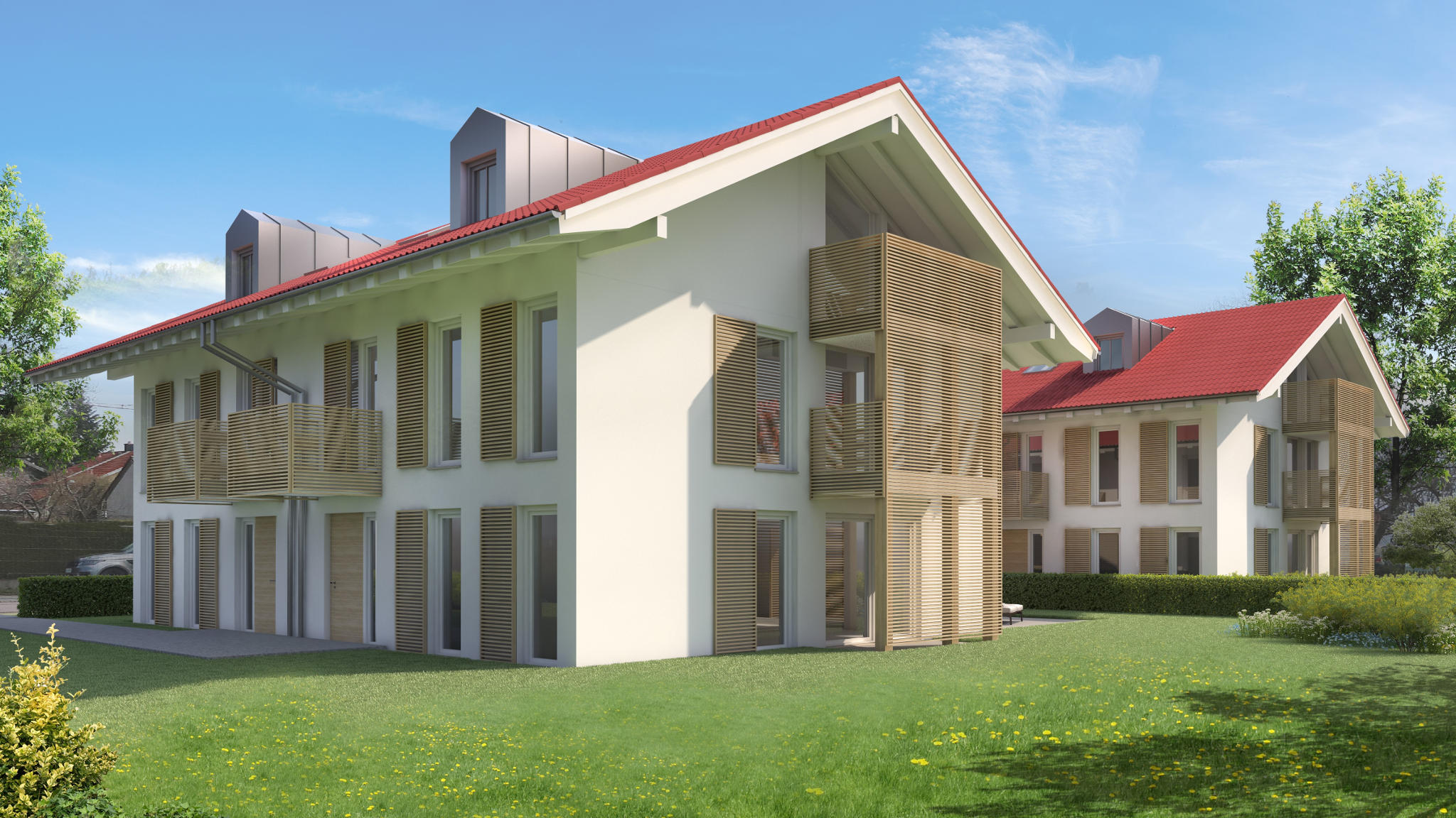 Die Kombination aus Holz und modernster Technik wie der Luft-Wasser-Wärmepumpe, der Photovoltaikanlage und der Somfy Smart-Home-Steuerung verleihen den Gebäuden einen einzigartigen Charakter.