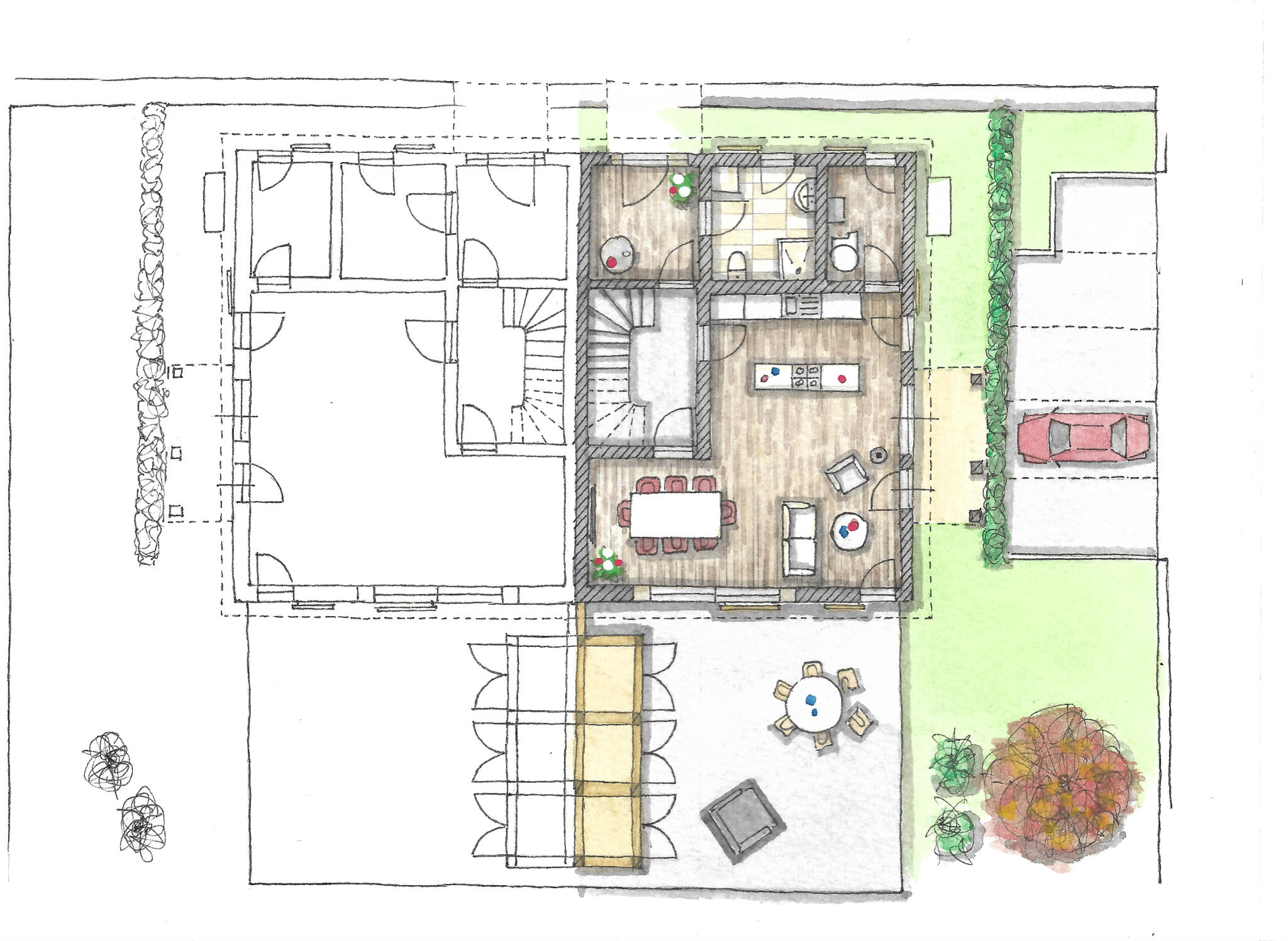 | Große Terrasse im privaten Garten und Rigolen (Zisterne) für Regenwassernutzung |