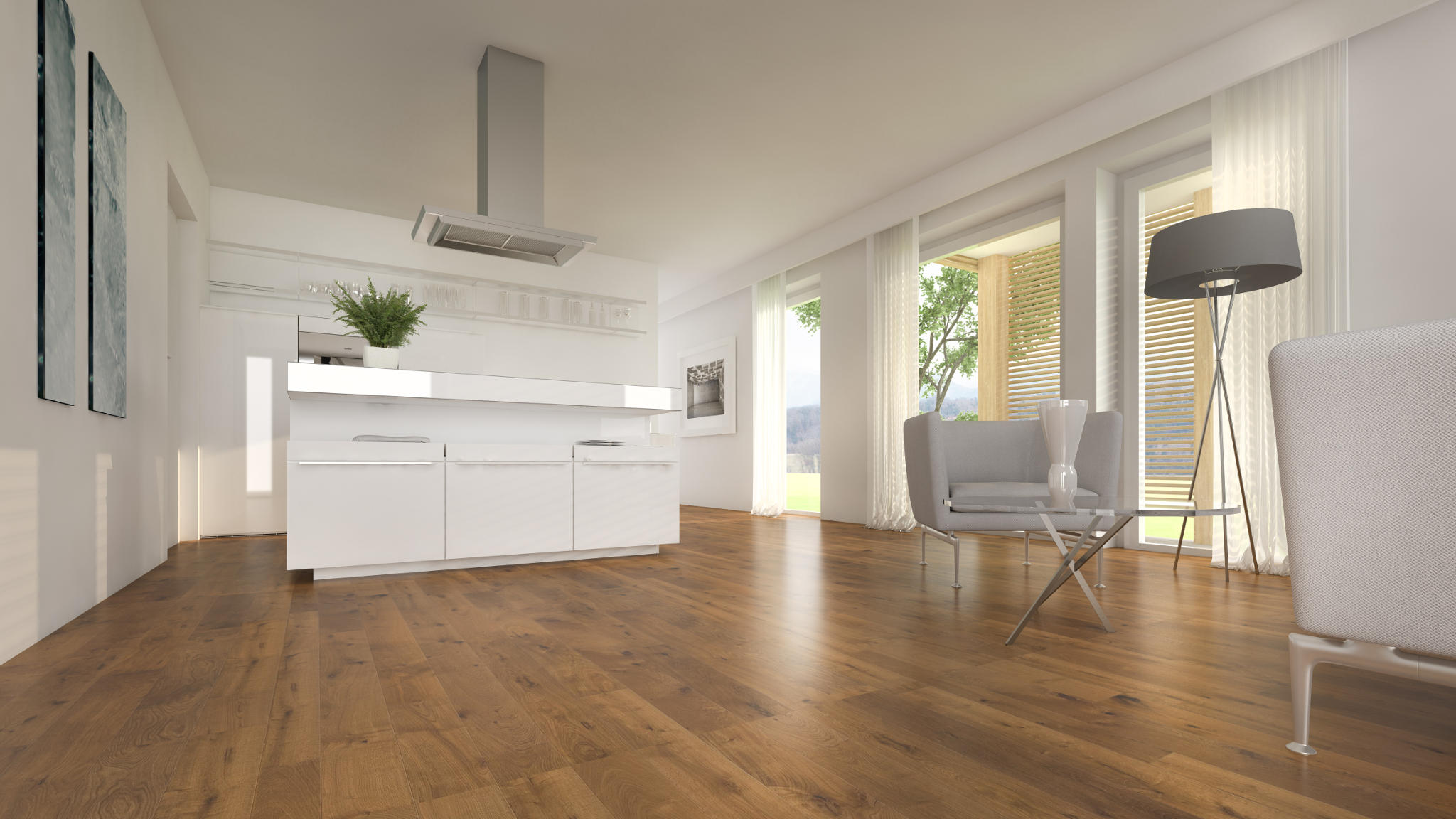 | Premium-Böden mit Landhausdielen 2,2 m (Bernsteineiche Sauvage strukturiert) und großformatigen Feinsteinfliesen in Bädern und Speisekammer | |