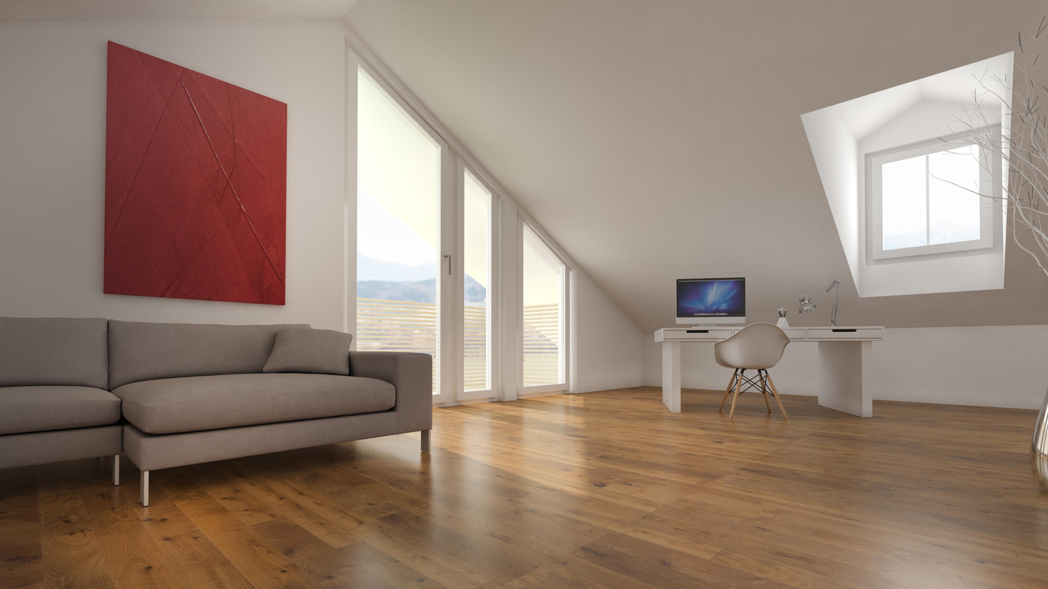 Besonderes Highlight ist das Studio im Dachgeschoss, welches durch seine Gauben und die extravagante Glasfront ein Refugium für Eltern oder kreatives Arbeiten bietet.